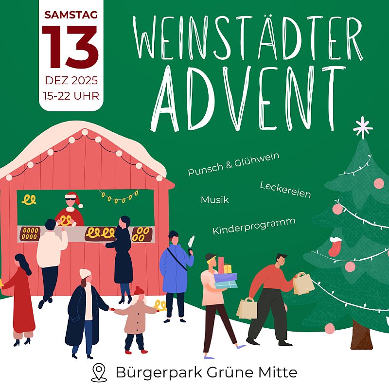 Zum zweiten Mal findet am Samstag, 13.12.2025 in der Zeit von 15:00 bis 22:00 Uhr der Weinstädter Advent im Bürgerpark in der Grünen Mitte beim Parkforum statt. Auch wir sind wieder mit unserem eigenen Stand dabei und schenken verschiedene Glühweine und Weine von der Remstalkellerei aus.- Datum: 13.12.2025